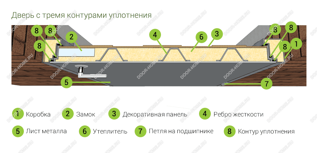 | Коробка и полотно: | многоконтурный профиль (толщина стали 1,2-1,8 мм (ОЦИНКОВАННАЯ СТАЛЬ – рекомендуем для двери в дом) с усилением полотна двери |