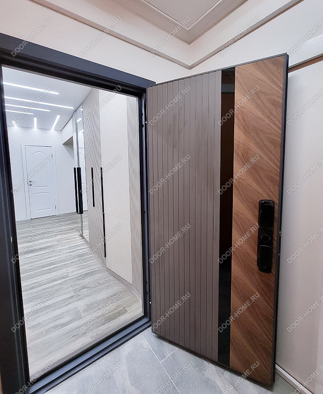 Стальная дверь с биометрическим электронным замком и МДФ с линейной фрезеровкой №03 Арт.DH-1266